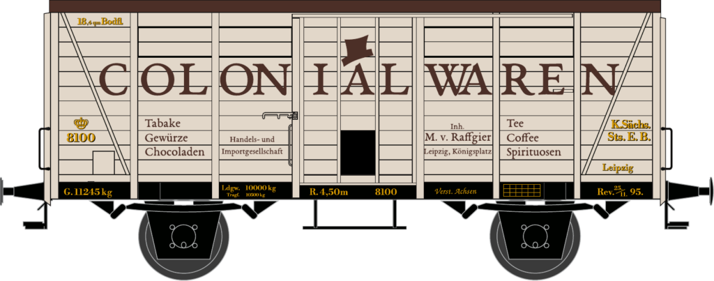 Gibt’s nur so halb. Gedeckte Güterwagen wurden damals kaum (gar nicht?) privat beschafft – es war schlichtweg günstiger, diese für jeden einzelnen Transportauftrag von den K.Sächs.Sts.E.B. zu mieten. Entsprechend konnten wir auch keinen einzigen Beleg finden, dass diese je mit Werbung versehen wurden. Die Geschichte über die Sonderausstattung unserer Wagen gibt uns die willkommene Ausrede, um diese wirklich schönen Wagenformen in ansprechender Bedruckung umsetzen zu können.
