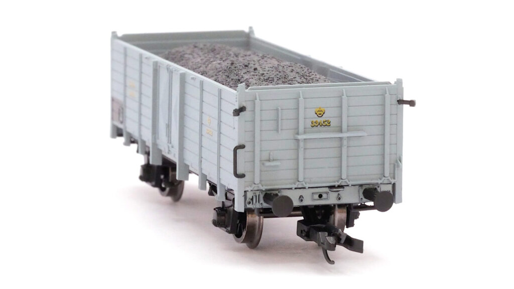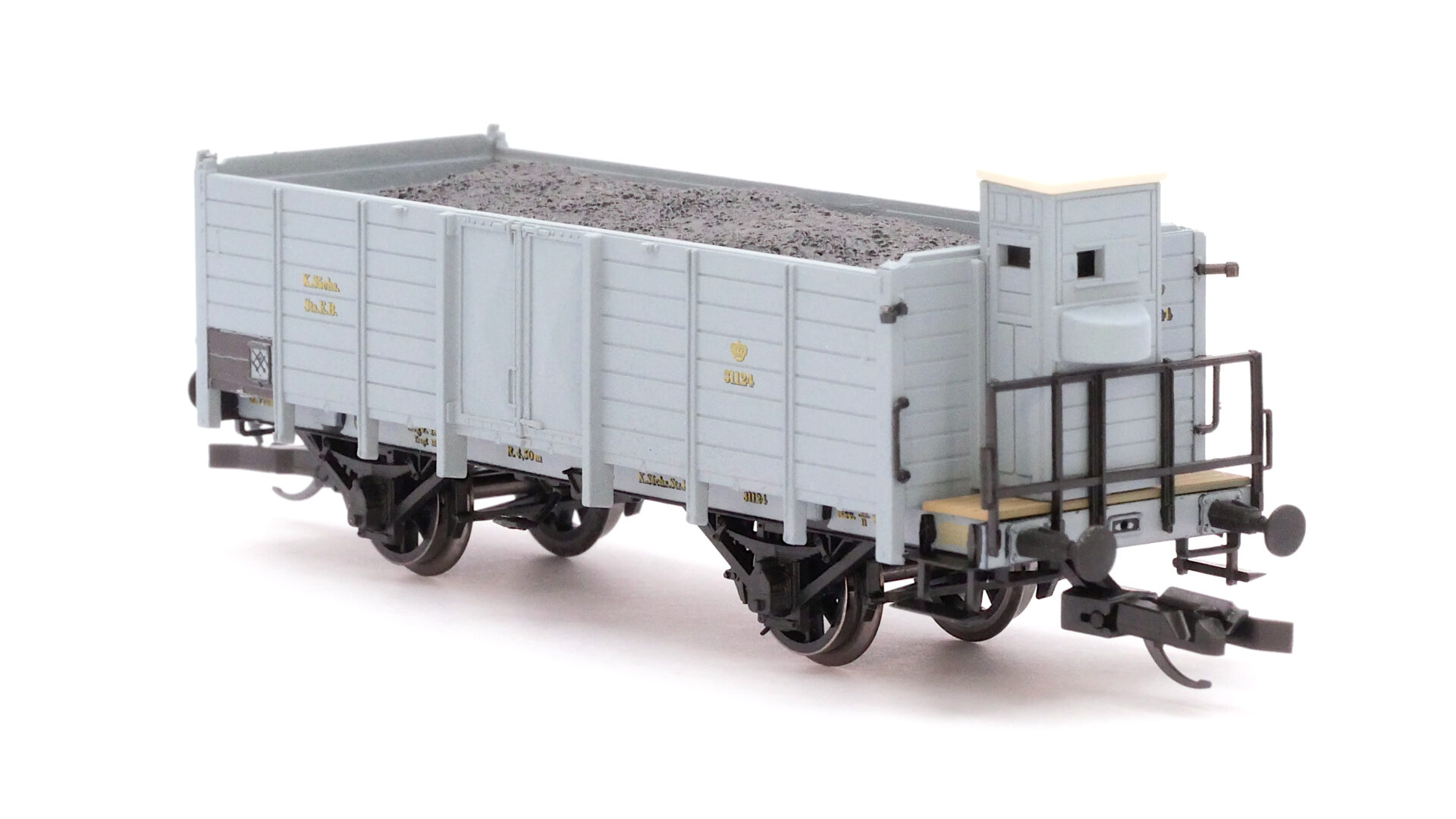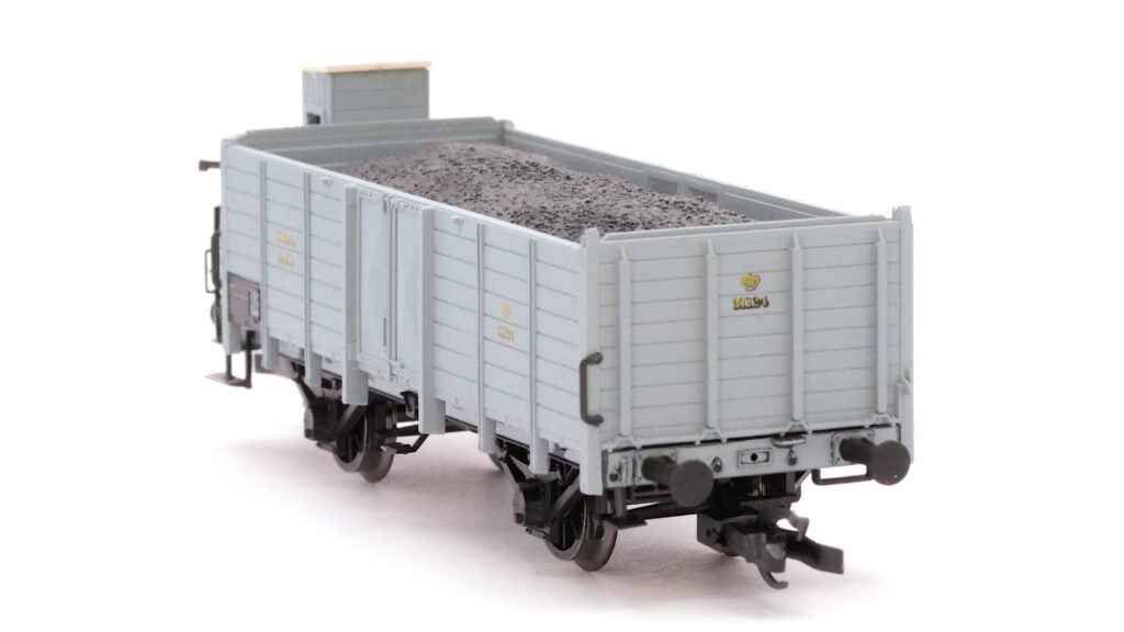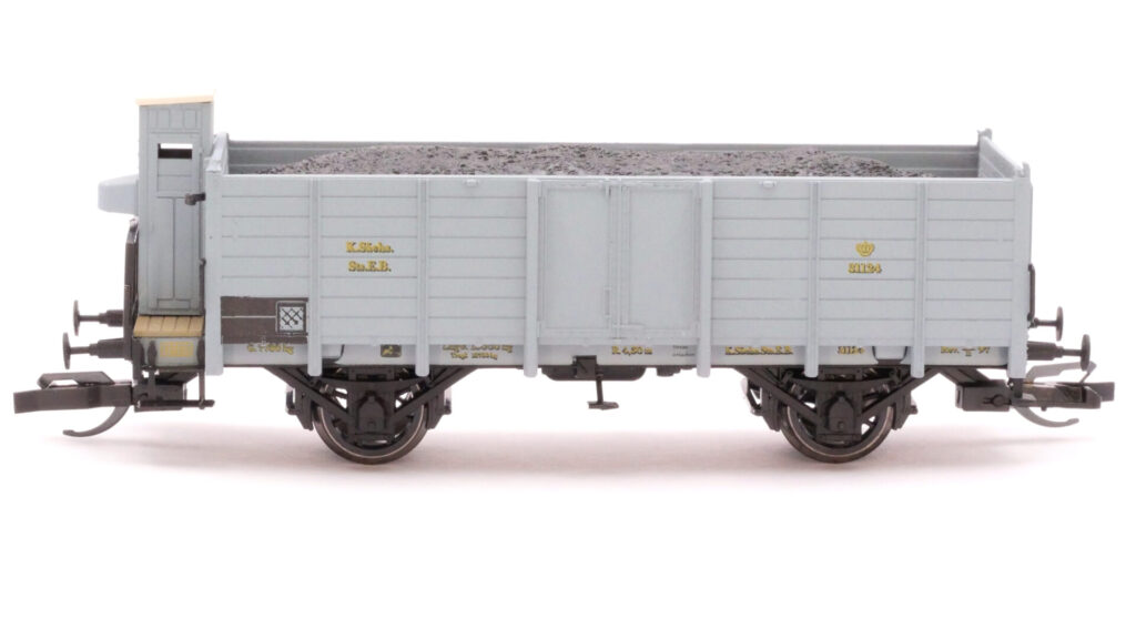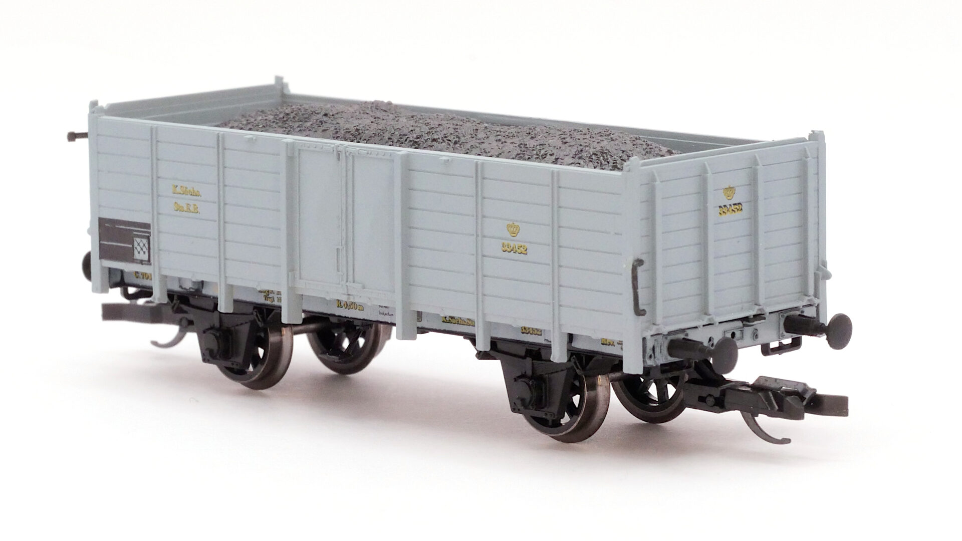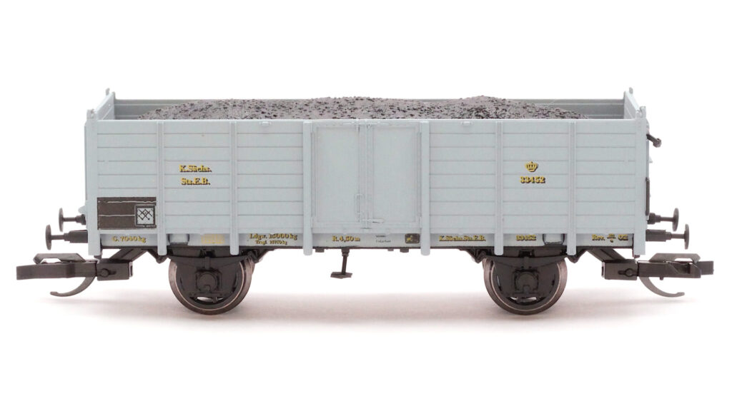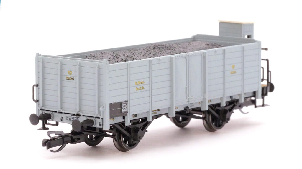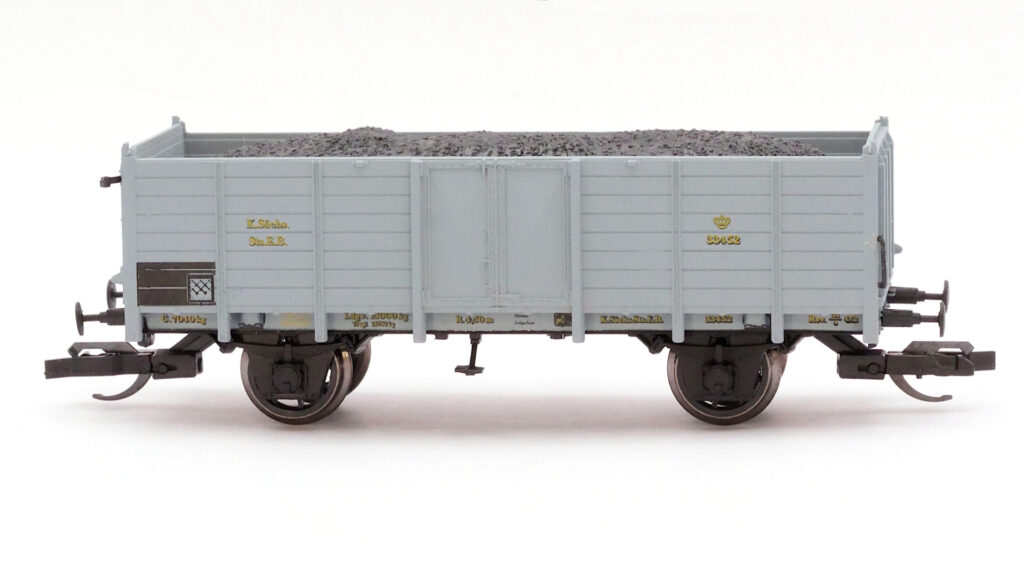 In der Gattung O3 reihten die K.Sächs.Sts.E.B. verschiedene Bauarten offener Güterwagen mit 15t Ladegewicht ein. Diese hatten zumeist 4,50m Achsstand und kamen auch sonst der hier genutzten Form zumindest halbwegs nahe, weswegen wir uns bei einer der O3-Bauarten, der lfd. Nr. 416, entsprechende Wagennummern ausleihen. Die Neuauflage verfügt jetzt u.a. über vorbildgerecht graue Rahmen, schattierte Anschriften auch an den Langträgern und als Bonus gibt es diesmal sogar eine Kohleladung dazu! Erstmalig erscheint der Wagen zudem sowohl in einer gebremsten als auch einer ungebremsten Ausführung.