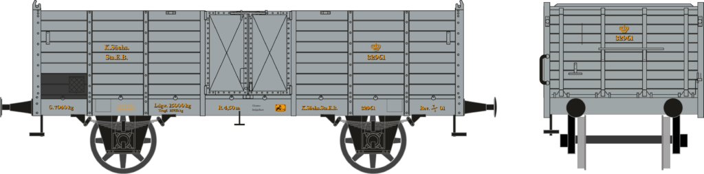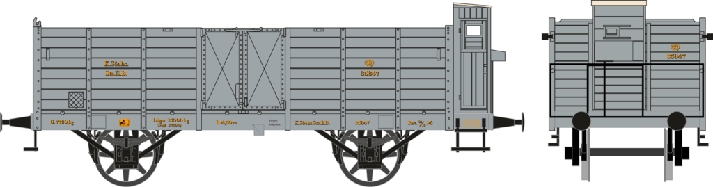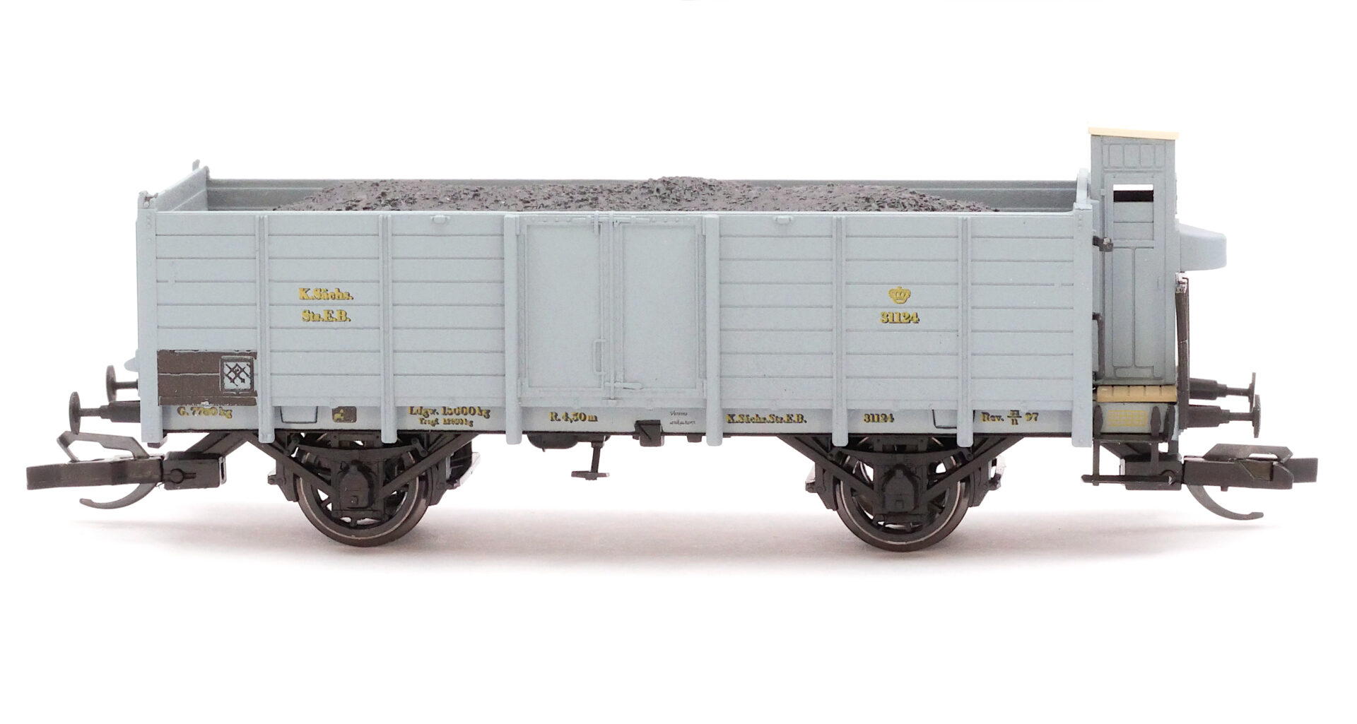 In der Gattung O3 reihten die K.Sächs.Sts.E.B. verschiedene Bauarten offener Güterwagen mit 15t Ladegewicht ein. Diese hatten zumeist 4,50m Achsstand und kamen auch sonst der hier genutzten Form zumindest halbwegs nahe, weswegen wir uns bei einer der O3-Bauarten, der lfd. Nr. 416, entsprechende Wagennummern ausleihen. Die Neuauflage verfügt jetzt u.a. über vorbildgerecht graue Rahmen, schattierte Anschriften auch an den Langträgern und als Bonus gibt es diesmal sogar eine Kohleladung dazu! Erstmalig erscheint der Wagen zudem sowohl in einer gebremsten als auch einer ungebremsten Ausführung.